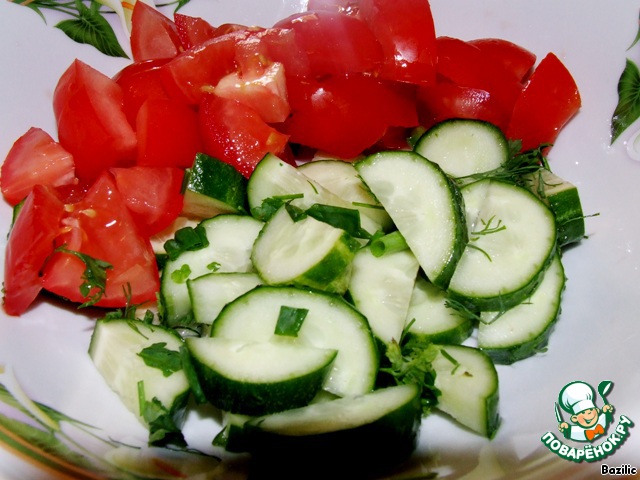 4. Нарезаем крупно огурцы и помидоры, режем петрушку и лук.