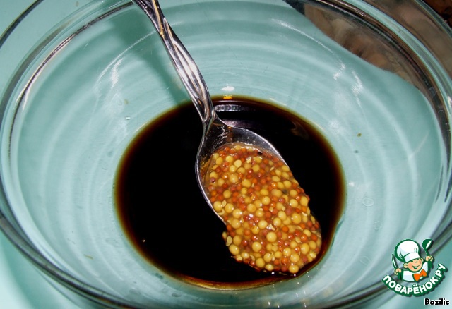 5. Для соуса смешиваем бальзамический уксус и горчицу в зернах, добавляем оливковое масло.