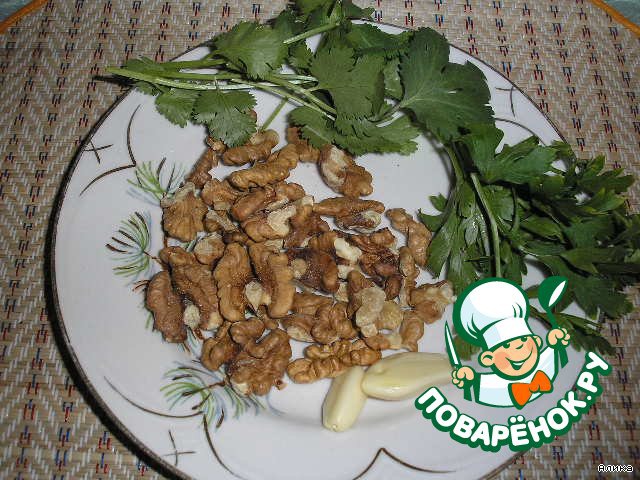 Грецкие орехи, зелень, чеснок пропускаем через мясорубку.