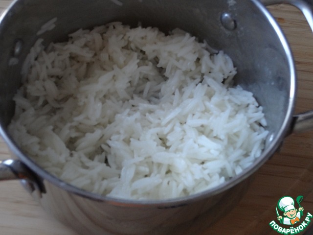 Промойте рис. Засыпьте его в кастрюлю, залейте бульоном и доведите до кипения. Помешайте, накройте крышкой и варите минут 10, пока рис не станет мягким и не впитает весь бульон. Мне очень понравился в этом рецепте рис БАСМАТИ GOLD пропаренный ароматный. Он очень красивый и никогда не слипается.