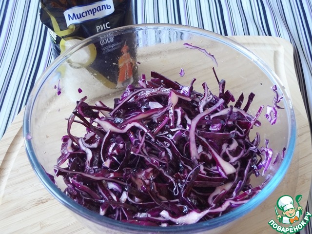 Нашинкуйте краснокачанную капусту и положите ее в миску с маринадом, хорошенько перемешайте и оставьте мариноваться.