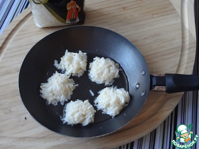 Разогрейте на сковороде растительное масло и выкладывайте чайной ложкой рисовую массу, чтобы получились маленькие котлетки диаметром около 2,5см. Жарьте на умеренном огне с обеих сторон до золотистого цвета. Котлетки хорошо держат форму.