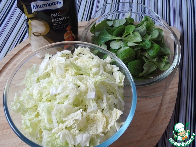 Нашинкуйте китайскую капусту и нарежьте листья пак-чой, если они крупные. У меня не пак-чой. Я взяла листья салата корн.