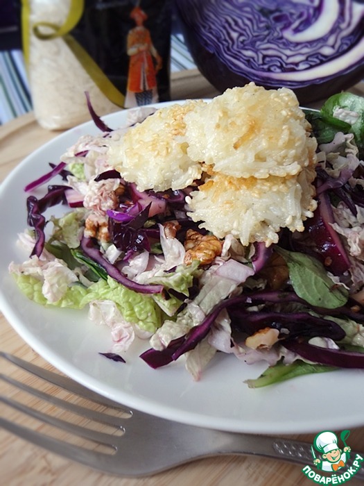 | Маленькие рисовые котлетки с кунжутом - необычное дополнение к хрустящему салату из грецких орехов, маринованной краснокочанной капусты и листового салата, заправленному освежающей апельсиновой заправкой. |