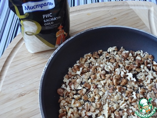 Порубите орехи ножом и насыпьте их в сковороду с антипригарным покрытием. Жарьте их на среднем огне около 3 минут, часто помешивая, до золотистого цвета. Пересыпьте в тарелку и оставьте в сторону.