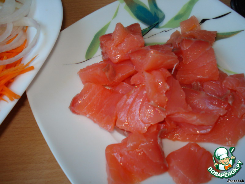 Рыбу разрезать на кусочки (вкусно получится и с обжаренной рыбкой).
