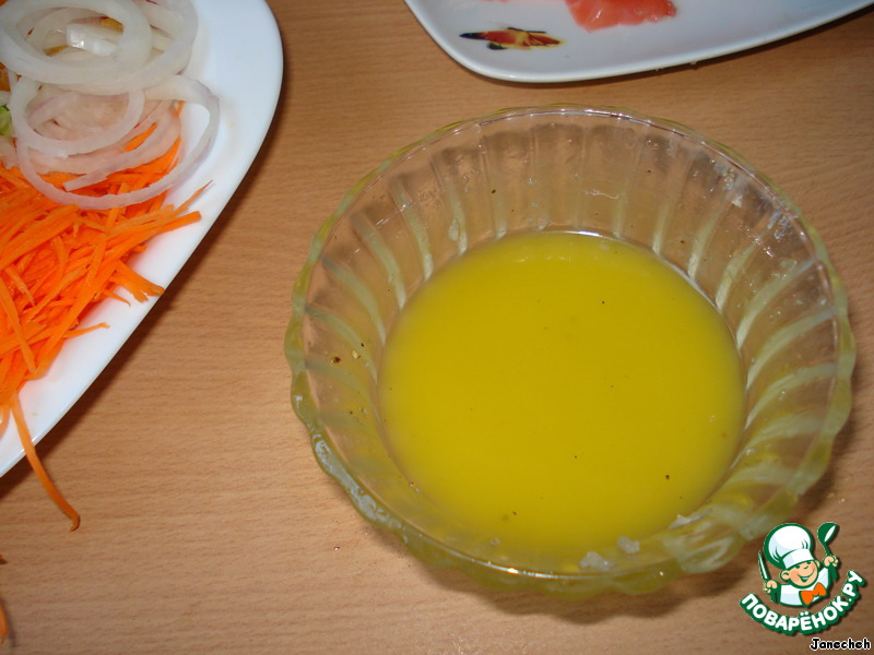 Сделаем заправку. Чеснок измельчим, добавим оливковое масло и лимонный сок - хорошо взбить. Потом добавим соль и перец по вкусу, размешаем все хорошо.