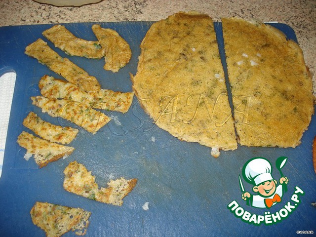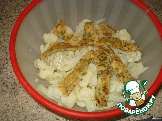 Готовим омлетик (яйца, молоко, 1-2 ст. л. муки, соль), после чего режем его на полосочки для нашего салатика, примерно такого размера как на фото.