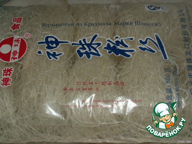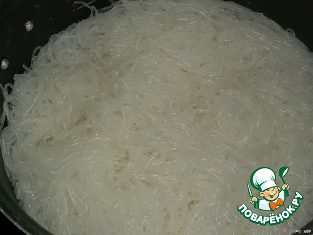 Лапшу поместить в кипящую воду и варить 4 -5 минуты, откинуть на дуршлаг и промыть холодной водой. С помощью ножниц лапшу порезать.