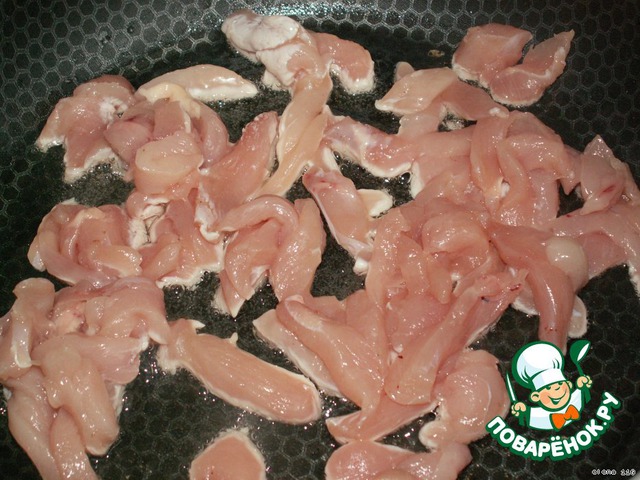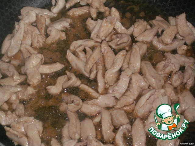 Куриное филе порезать тонкой соломкой и обжарить до готовности на растительном масле.