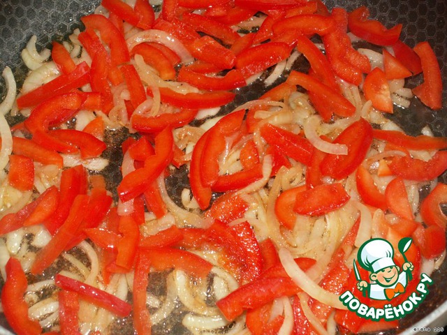 Перец порезать тонкой соломкой и добавить к луку, продолжать обжаривать.
