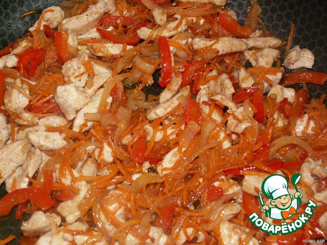 К готовым овощам добавить куриное филе, лапшу, приправу, соль и раздавленный чеснок, соевый соус, уксус, сахар.