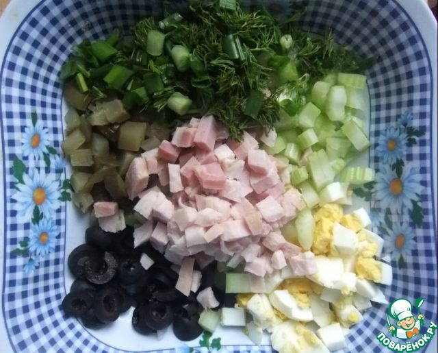 Тем временем мелко нарезать и смешать в салатнице яйца, бекон, маслины, сельдерей, маринованные огурцы, зеленый лук и укроп.