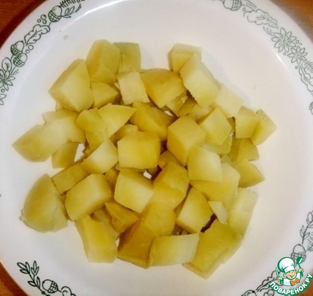 Отваренный картофель остудить, очистить и нарезать на крупные кубики.