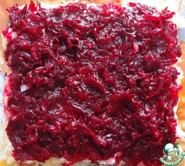 Следующий слой - свекла, натертая на терке. Смазать майонезом.