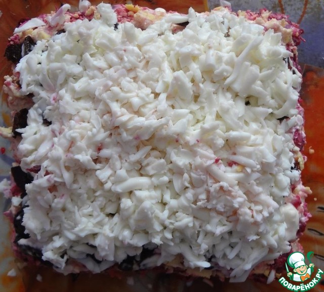 Следующим слоем натираем яичные белки. Смазываем майонезом.