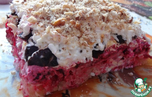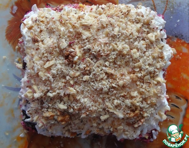 Следующий слой нарезанный мелко чернослив. Чтобы чернослив стал мягче, нужно залить его кипятком минут на 10-15. Смазать майонезом.