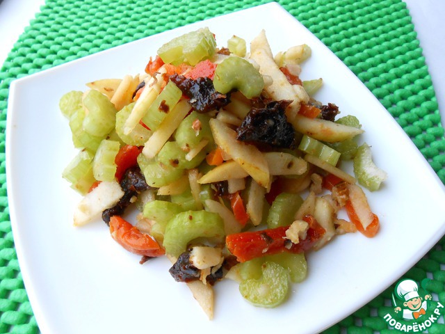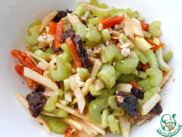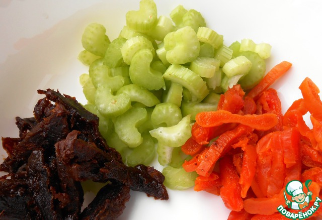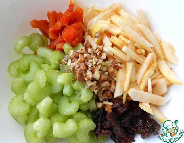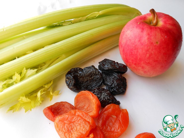 Сельдерей нарезать. Курагу и чернослив залить кипятком минут на 10, выложить на бумажные салфетки для удаления лишней влаги, затем нарезать соломкой.