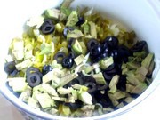 Порей режем кольцами, салат тонкой соломкой, маслины кружочками.