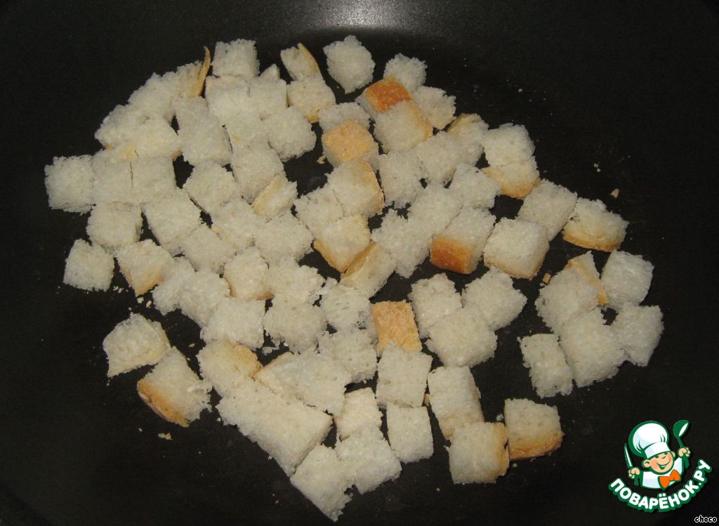 Обжариваем сухарики на сухой сковороде - я немного сбрызгиваю водой вначале, чтобы получились более хрустящими. Кстати, делала и с сухариками из ржаного хлеба - не менее вкусно получается.