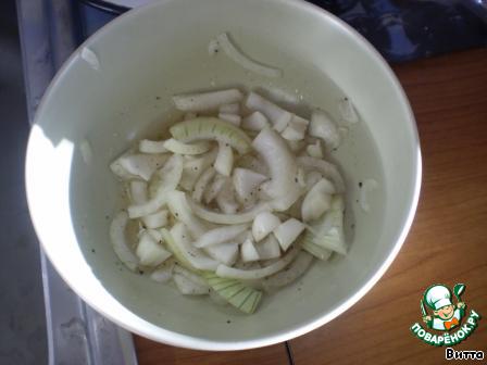 Смешиваем масло с уксусом, перчим, солим и маринуем в этой заправке лук, нарезанный полукольцами