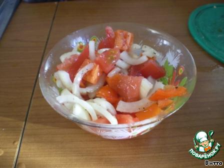 Помидоры и перец режем крупно. Добавляем лук, заправку. Перемешиваем.