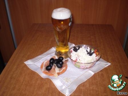 Наливаем любимому мужчине бокал пива, ставим рядом салатик, тарелочку с оливками и пршутом (вяленый высоко в горах Черногории свиной окорок).