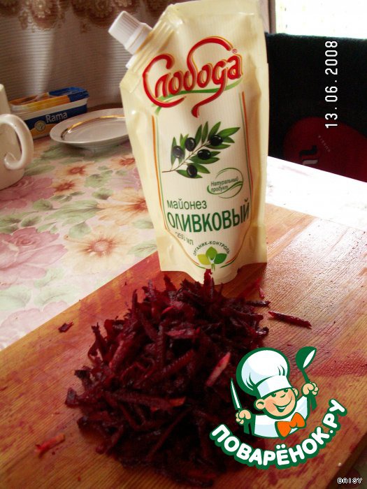 Потереть на крупной терке сырую свеклу. Майонез в данном случае смягчает вкус сырой свеклы.