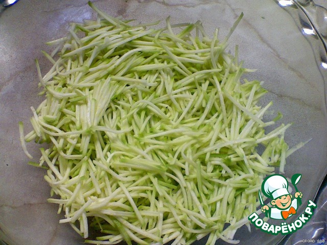 Натереть на тeрке кабачок (предварительно очистив его от кожицы).