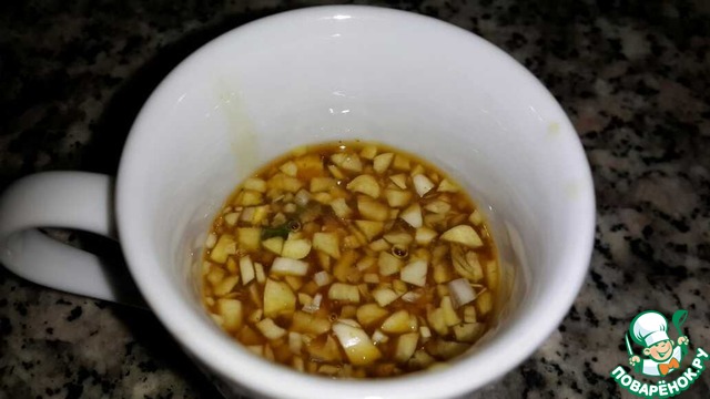 В отдельной посуде смешать мёд, лимонный сок, измельчённый чеснок, горчица.