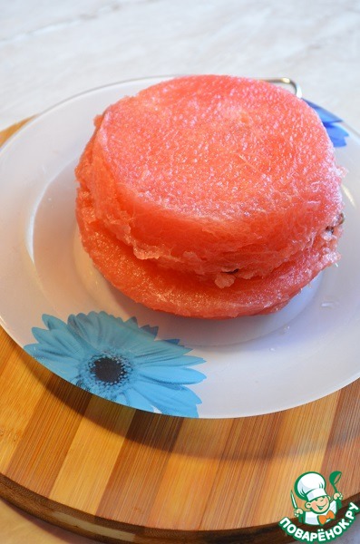 Арбуз вырезать большим стаканом или пиалой, нам потребуется 2 кусочка, арбуз необходимо сдвух сторон немного присолить. По желанию можно сбрызнуть лимонным соком.