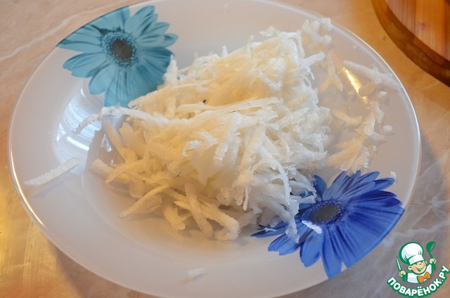 | Этот рецепт я нашла в одном из кулинарных блогов. Правда, там использовался редис, я заменила его на дайкон. Этот салат просто взрыв вкуса, его невозможно описать! Обязательно попробуйте! Кстати, вся зелень - руккола, мята и кинза (кориандр) выращены у меня на грядочках. |