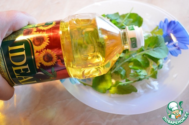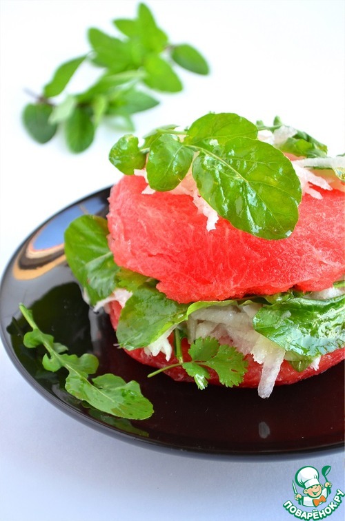 Добавить к дайкону рукколу, мяту, кинзу, щепотку имбиря, соль, подсолнечное масло "IDEAL" микс подсолнечного и оливкового масел и хорошо перемешать. Далее остается собрать салат, выкладываем на тарелочку один круг арбуза, на него дайкон с зеленью, закрываем вторым кусочком арбуза, сверху выкладываем немного дайкона с зеленью.