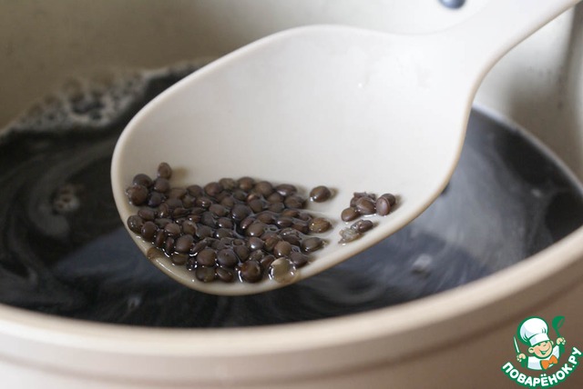 * Я варю без добавления соли около 15 минут после кипения на слабом огне. Готовую чечевицу для этого салата промываю под холодной проточной водой.