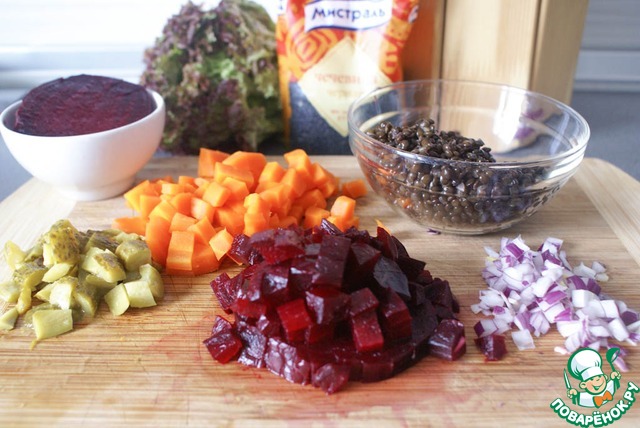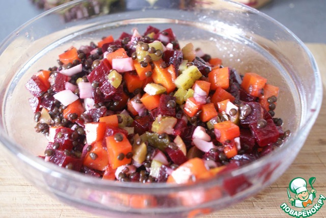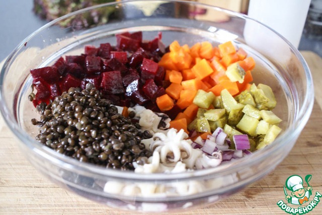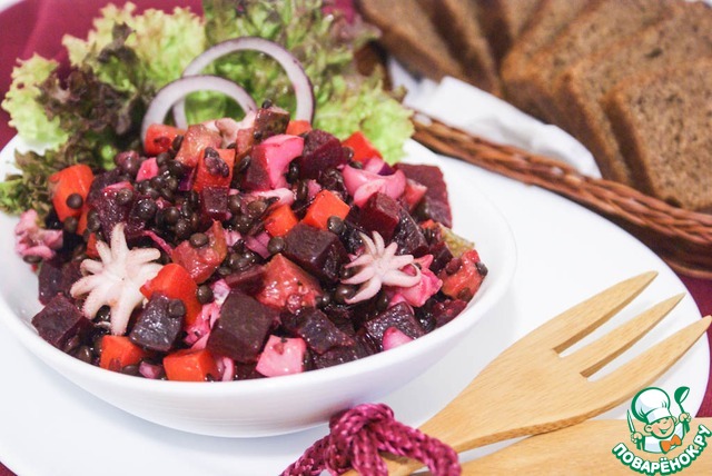 * Салат имеет ярко выраженный овощной вкус и хорошо сочетается с черной чечевицей. Никаких дополнительных ингредиентов вроде горошка или кислой капусты он не требует, т. к. в этом случае вкус чечевицы просто потеряется. Такой вариант намного полезнее (и на мой взгляд, вкуснее) традиционного винегрета. Вместо картофельного крахмала здесь присутствует полезнейший растительный белок, благодаря чечевице. Кальмары же выгодно дополняют вкус готового салата.