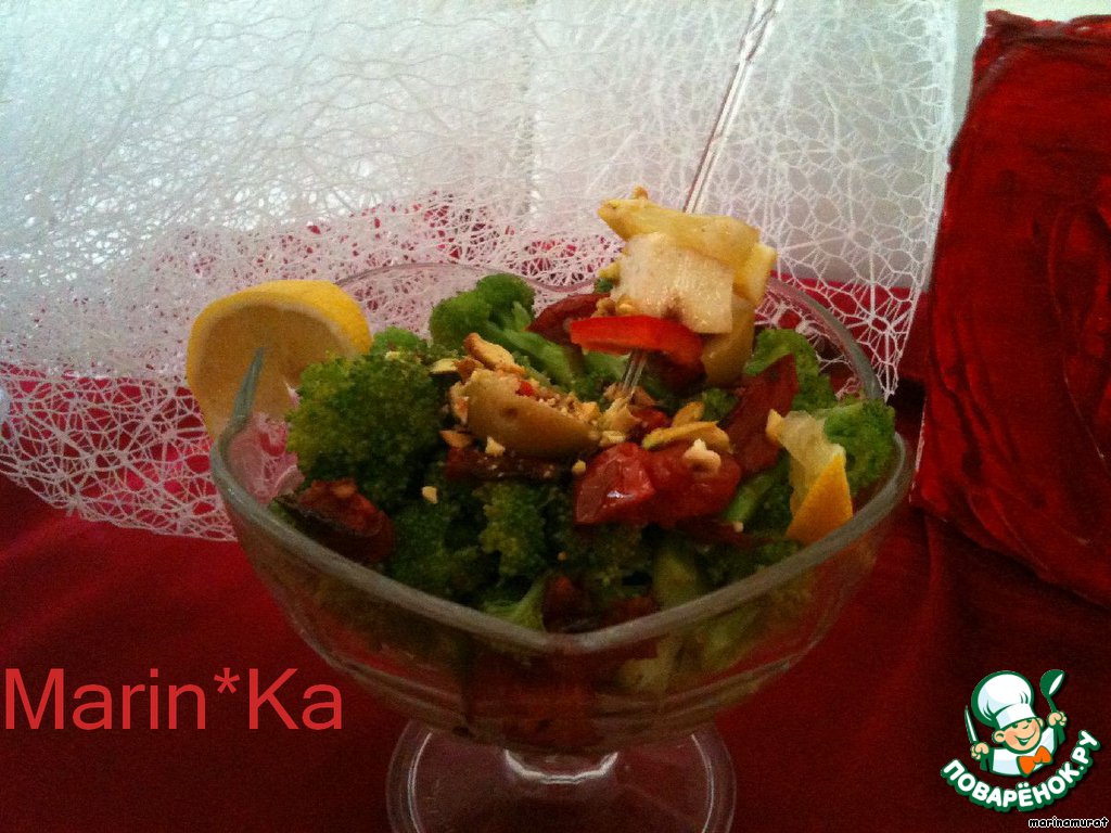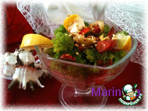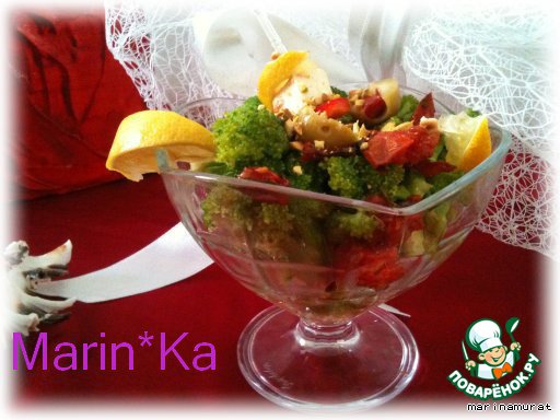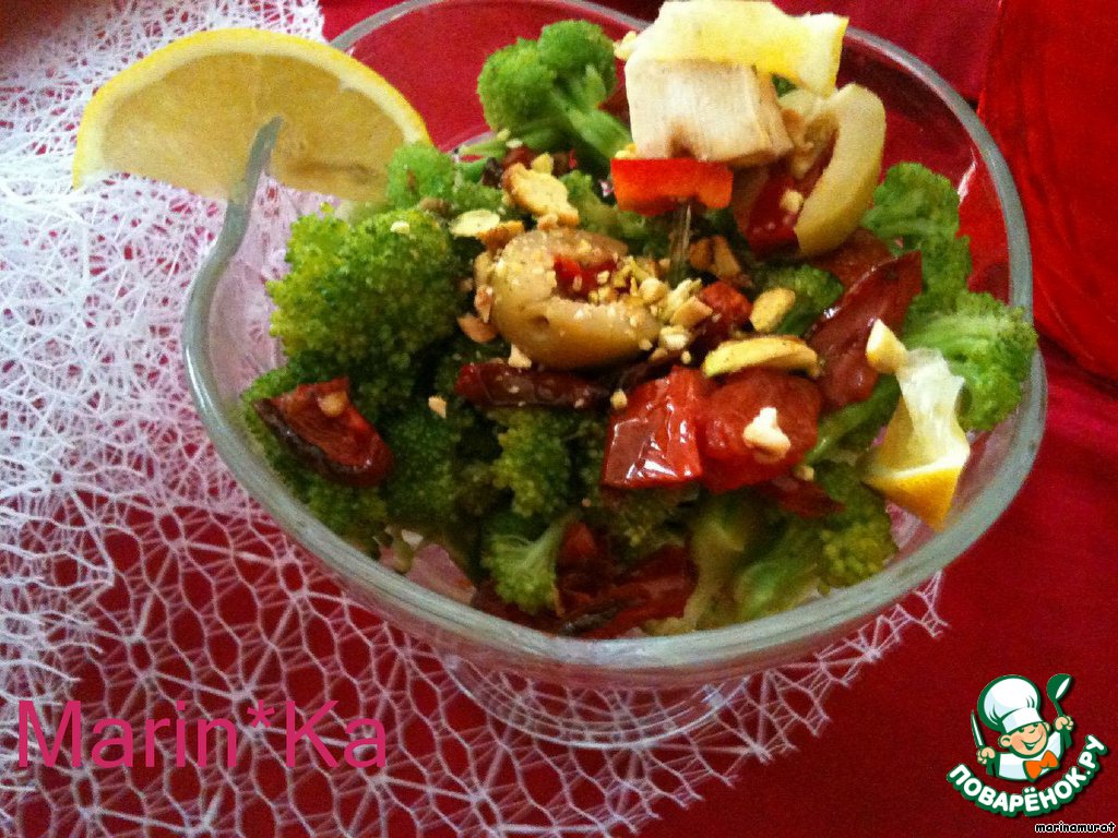 В еще горячую брокколи кладем мелко нарезанный чеснок, соль по вкусу, специи и сок лимона, перемешиваем. Для салата нужны запеченные помидоры, маринованные в масле либо вяленые. Если нет таковых, возьмите свеженькие, правда, вкус сильно изменится.
