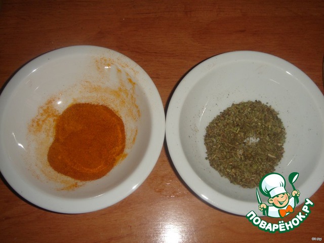 1 - смешать куркуму и сладкий перец. Куркума - это не только пряность, но еще она используется как краситель, окрашивает в ярко желтый цвет. Поэтому выбирайте посуду, которая не окрасится, например, стеклянную. В эмалированной белой мисочке точно останется желтый ореол.