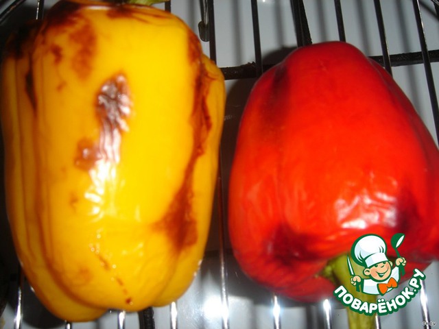 Перцы обжарить на гриле или в духовке и положить в полиэтиленовый пакет на несколько минут, чтобы потом легче было снять с них кожицу.