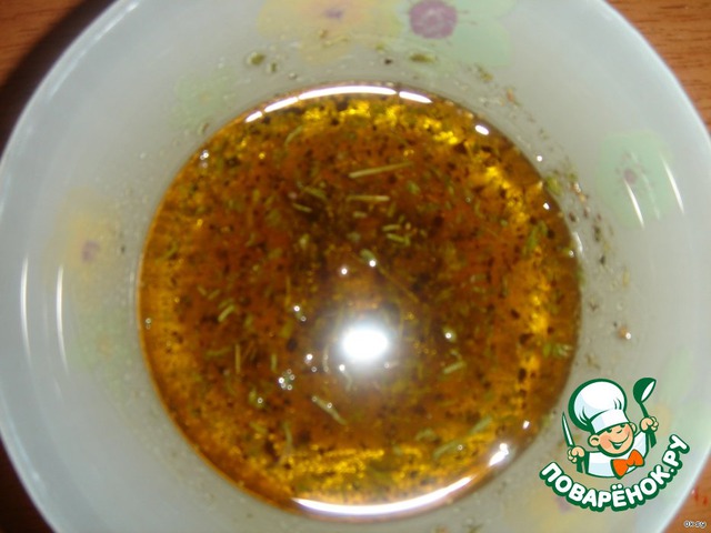 Подготовить заправку. Для этого истолочь в ступке перец, соль, листики чабреца (у меня в этот раз их не было, но это не отразилось на вкусе салата), добавить оливковое масло и бальзамический уксус. все перемешать и поделить заправку пополам. В одну часть заправки добавить продавленный в чеснокодавке чеснок.