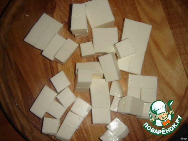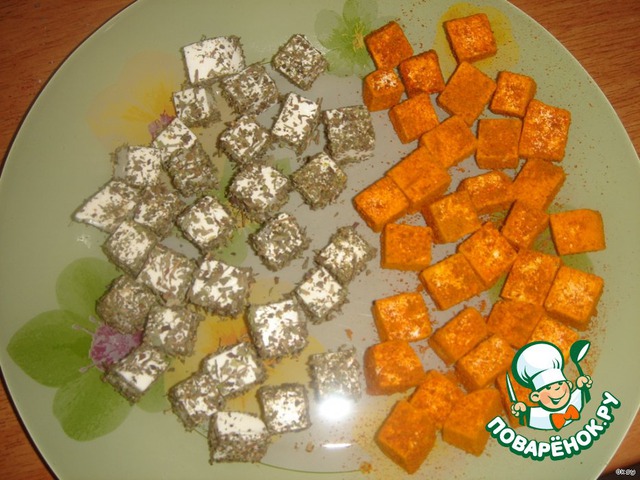 Обвалять половину кубиков сыра в травках, половину - в куркуме и перце.