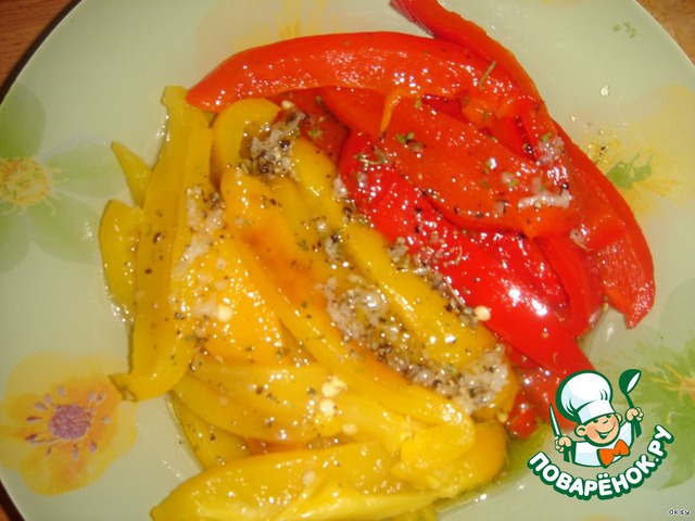 Помидоры залить заправкой без чеснока, перцы, очищенные от шкурки и порезанные длинными полосками, залить заправкой с чесноком.