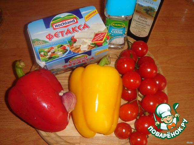 В креманки или широкие стаканы уложите немного перцев, помидоров, а сверху - несколько кусочков сыра. Выгладит очень аппетитно, а на вкус... Нет слов!