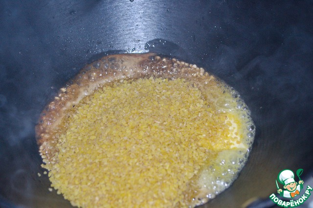 При приготовлении булгура лучше использовать сковороду- вок, если ее нет не страшно берите любую другую сковородку с крышкой. Растопите сливочное масло в воке, прогрейте его, всыпьте булгур. Ни при каких обстоятельствах не пытайтесь булгур промыть.