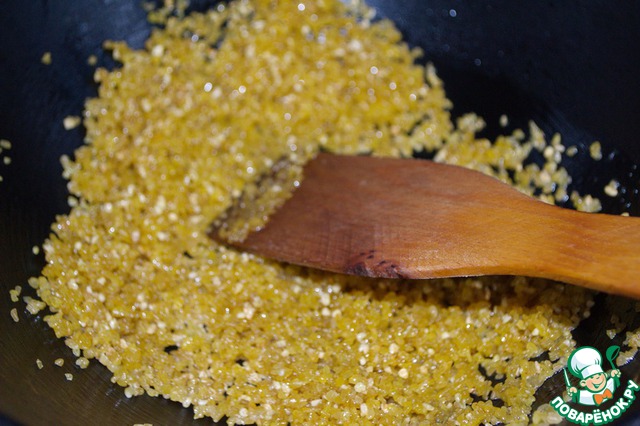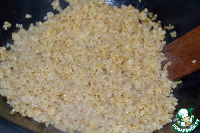 Помешивайте непрерывно, дождитесь орехового запаха. Опытные кулинары говорят, что булгуру можно дать немного подгореть – это тоже для аромата.