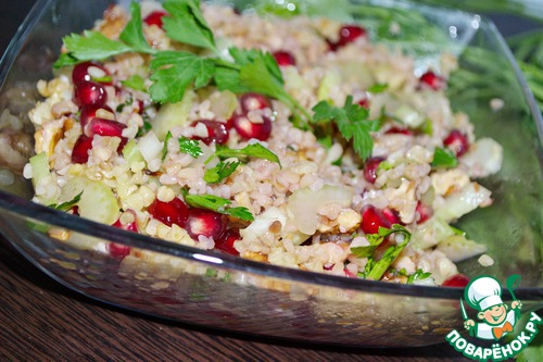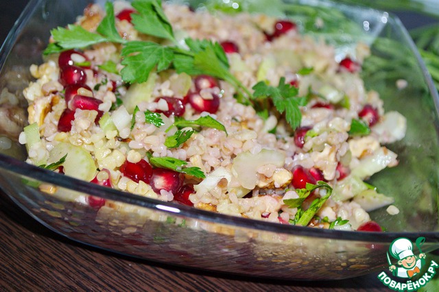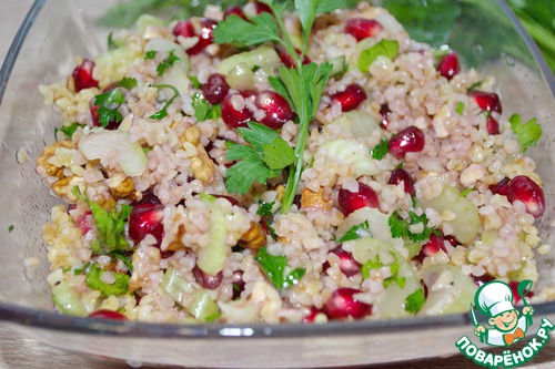 | Булгур – это полезно, вкусно, удобно и просто. В этом салате он дополнен драгоценными камнями граната, сельдереем и петрушкой. |