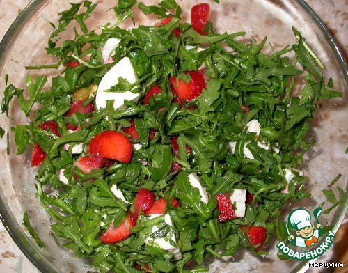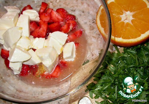 Нарезаем рукколу (не слишком крупно), клубнику (тоже не слишком крупно) и моцареллу (крупнее). Выдавливаем туда сок половинки апельсина.