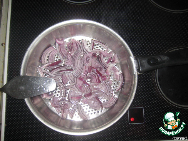 Красный лук, если среднего размера - полукольцами, если большого четверть-кольцами)))))