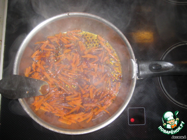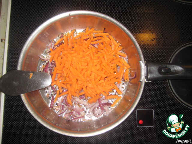 Минут через 5-7 кладем в лук морковь. Перемешиваем, тушим.