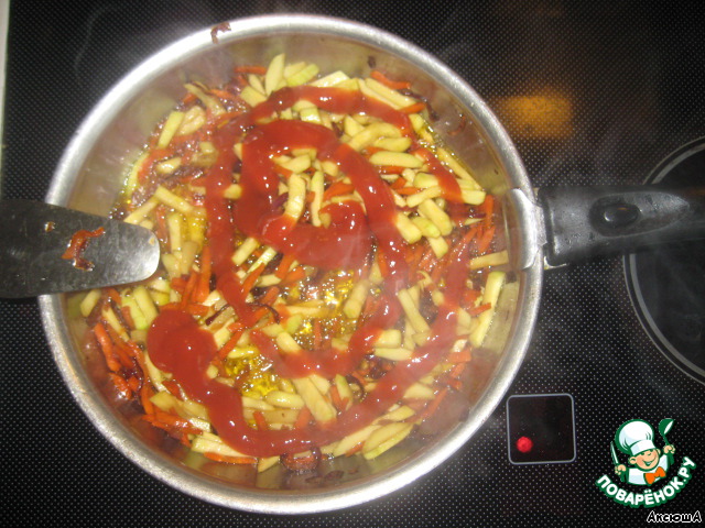 Когда кабачки станут мягкими, добавляем кетчуп (в ложках не измеряла, просто вылила по площади на свой вкус) и "Приправу для салатов". Перемешиваем в течение 5 минут.