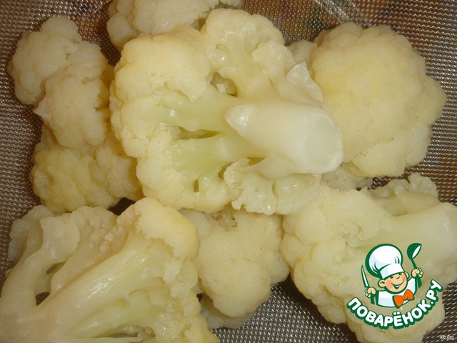Цветную капусту разобрать на крупные соцветия и поместить на 5 минут в соленую холодную воду, чтобы все находящиеся в капусте букашки вылезли из нее :)